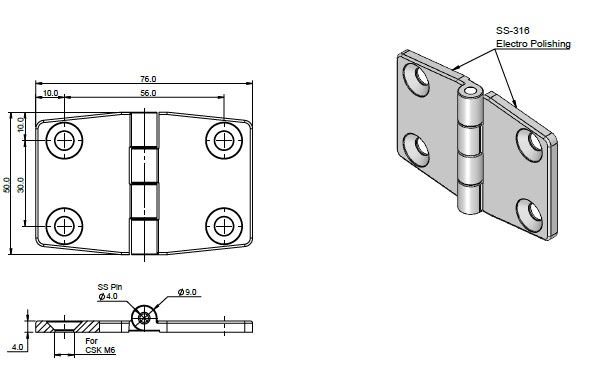 / Edelstahl 316 (A4) Scharnier - 4 Bohrungen