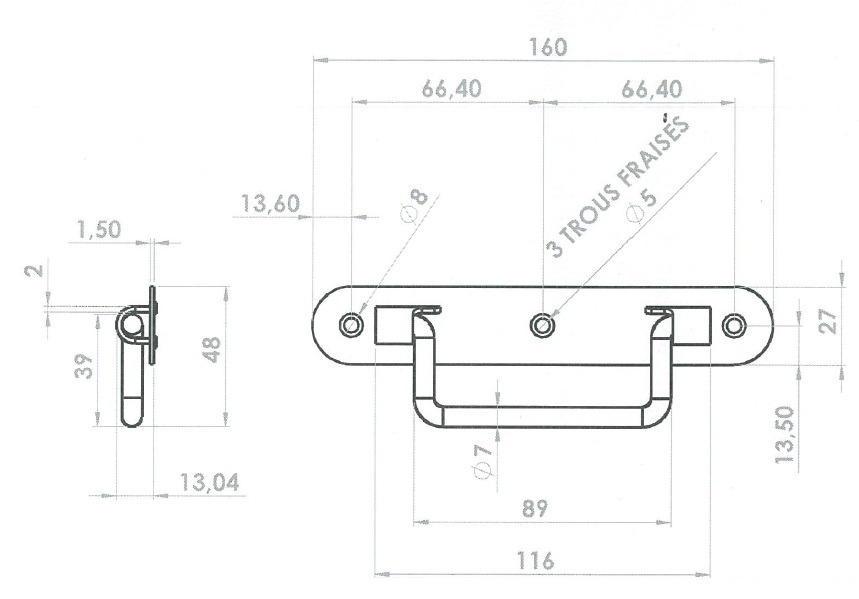 Flat plate Thickness 1.5mm, 3 countersunk holes Ø 5 mm.